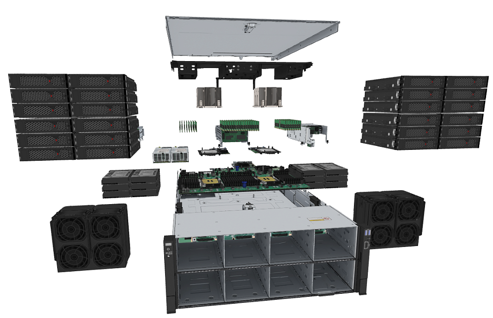 Компактный 2U форм-фактор с гибким дизайном шасси позволяет установить большое количество серверов в одной стойке высотой 42U, обеспечивая высокую плотность размещения оборудования. Модульная архитектура позволяет адаптировать сервер под конкретные требования: от минимальной конфигурации (один процессор, 8 ГБ памяти) до максимальной (два процессора, 8 ТБ памяти DDR5, 34 NVMe SSD).