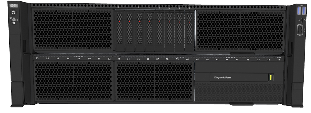 Компактный 2U форм-фактор с гибким дизайном шасси позволяет установить большое количество серверов в одной стойке высотой 42U, обеспечивая высокую плотность размещения оборудования. Модульная архитектура позволяет адаптировать сервер под конкретные требования: от минимальной конфигурации (один процессор, 8 ГБ памяти) до максимальной (два процессора, 8 ТБ памяти DDR5, 34 NVMe SSD).