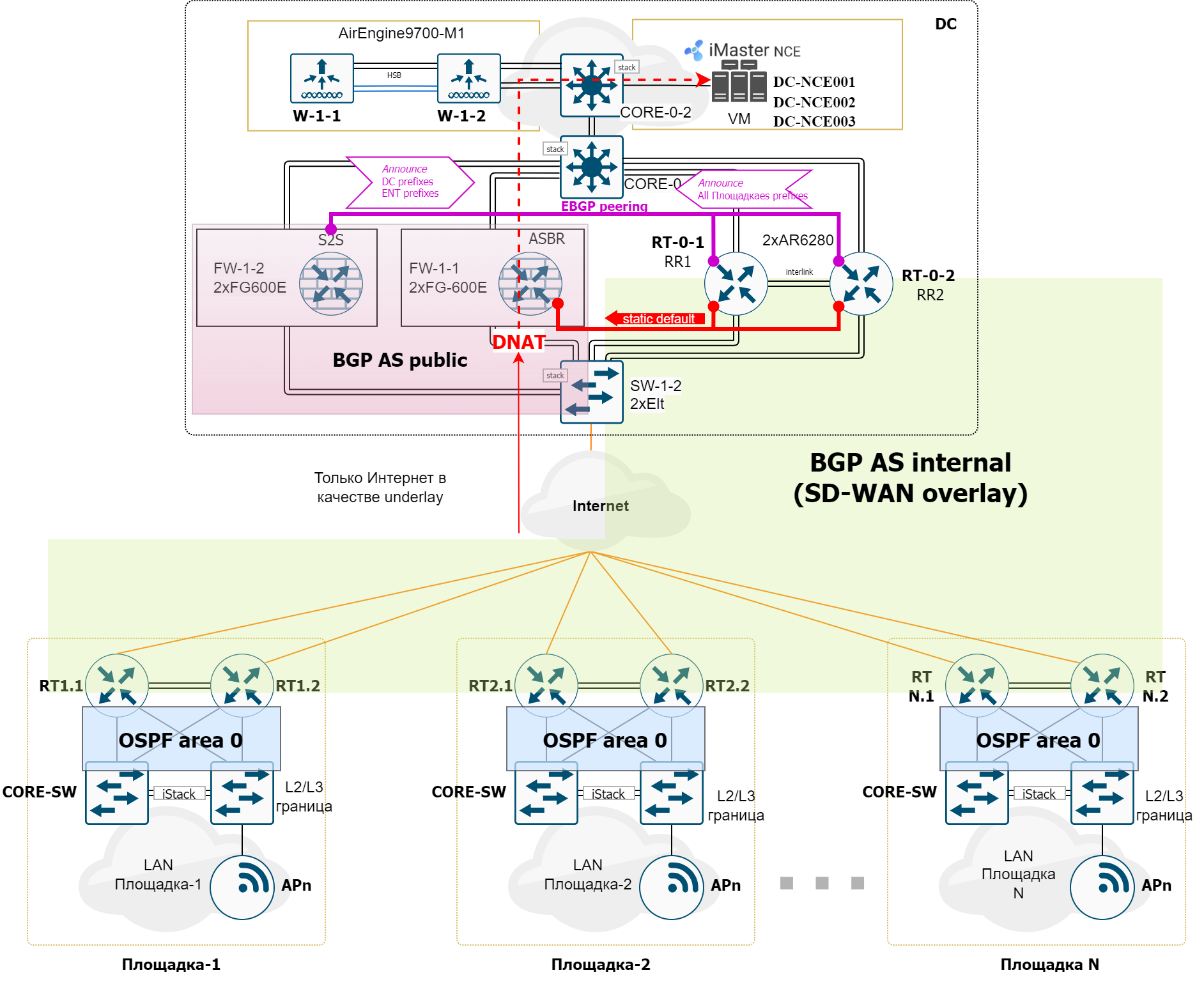 Команда Shanghai System Engineering спроектировала и внедрила комплексное решение на базе архитектуры Huawei SD-WAN под управлением контроллера iMaster NCE-Campus. Проект охватывает уровни WAN, ядра сети центральной площадки, филиальную сеть (50 предприятий холдинга) и беспроводной доступ (более 500 AP).