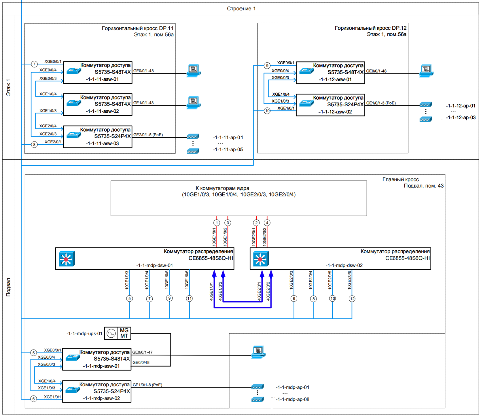 - Монтаж и наладка — прокладка кабельных трасс, установка и настройка активного оборудования, маркировка и тестирование линий связи.